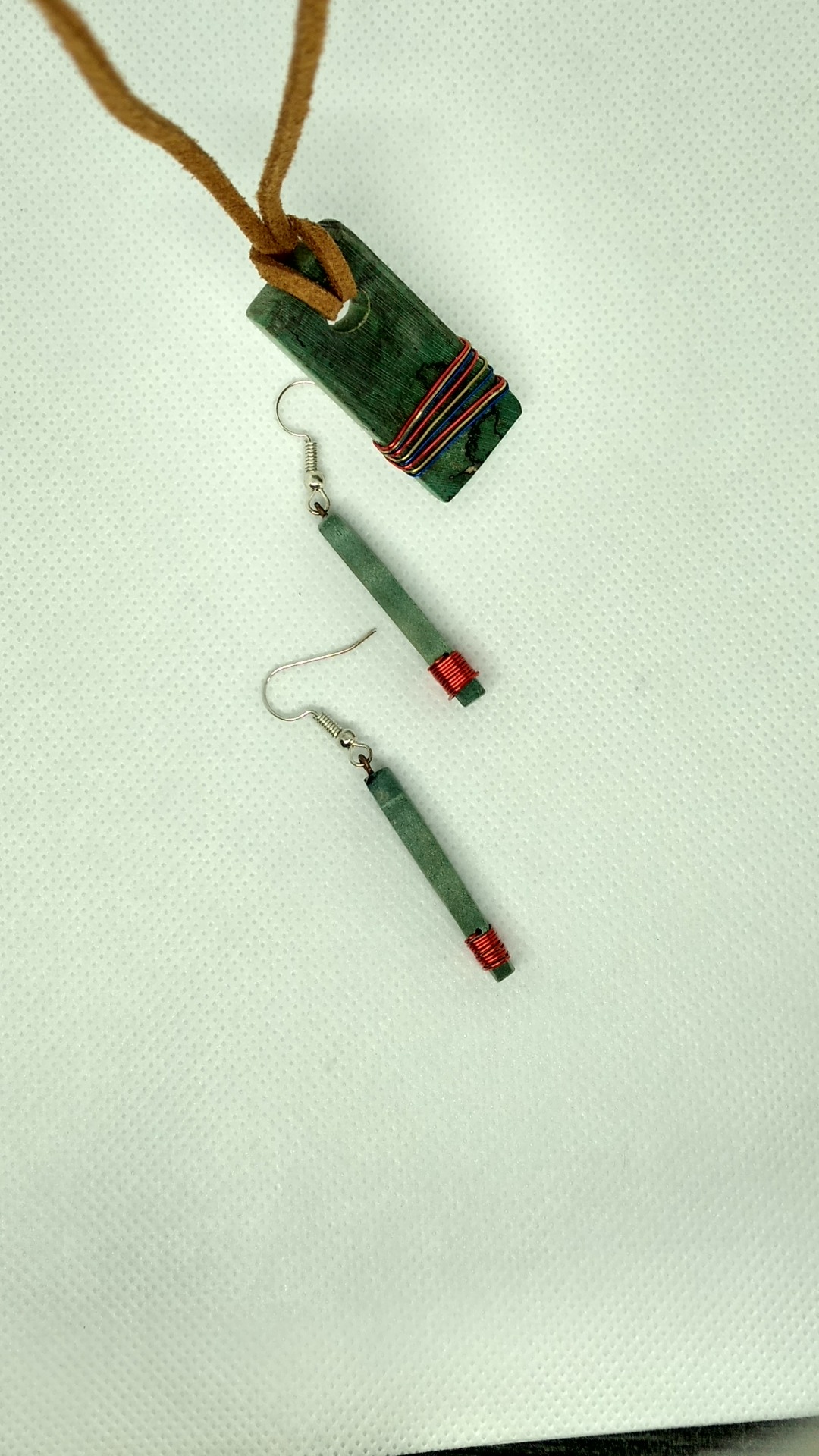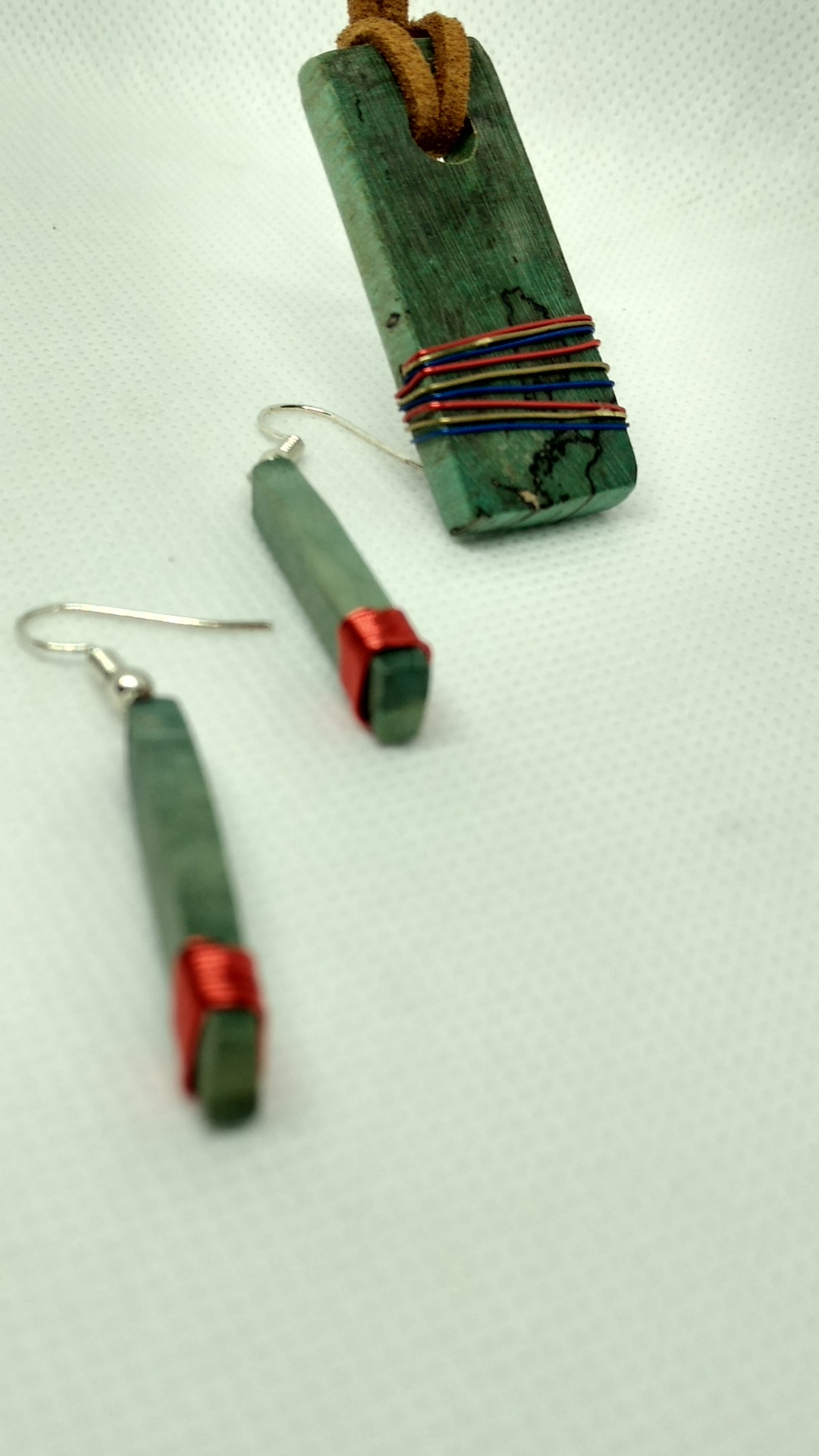 Set din lemn de paltin stabilizat cu rasina verde. Deco - fir metalic rosu si tricolor pe pandativ.