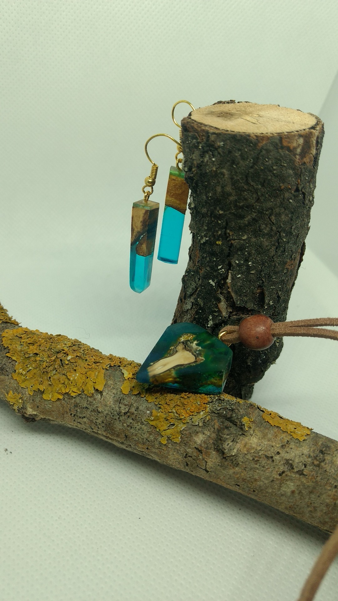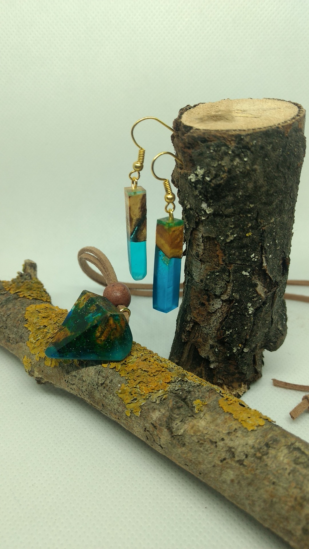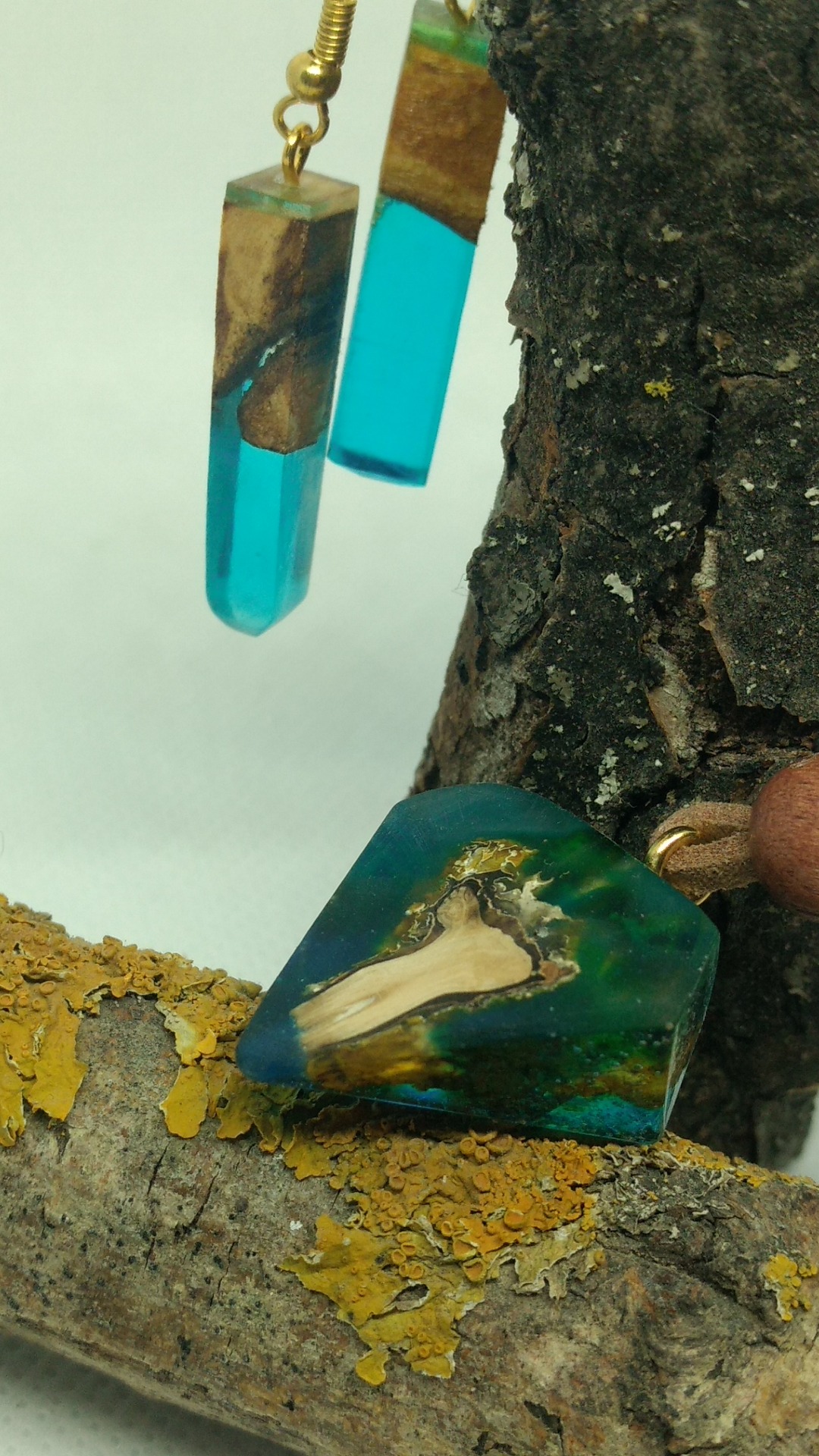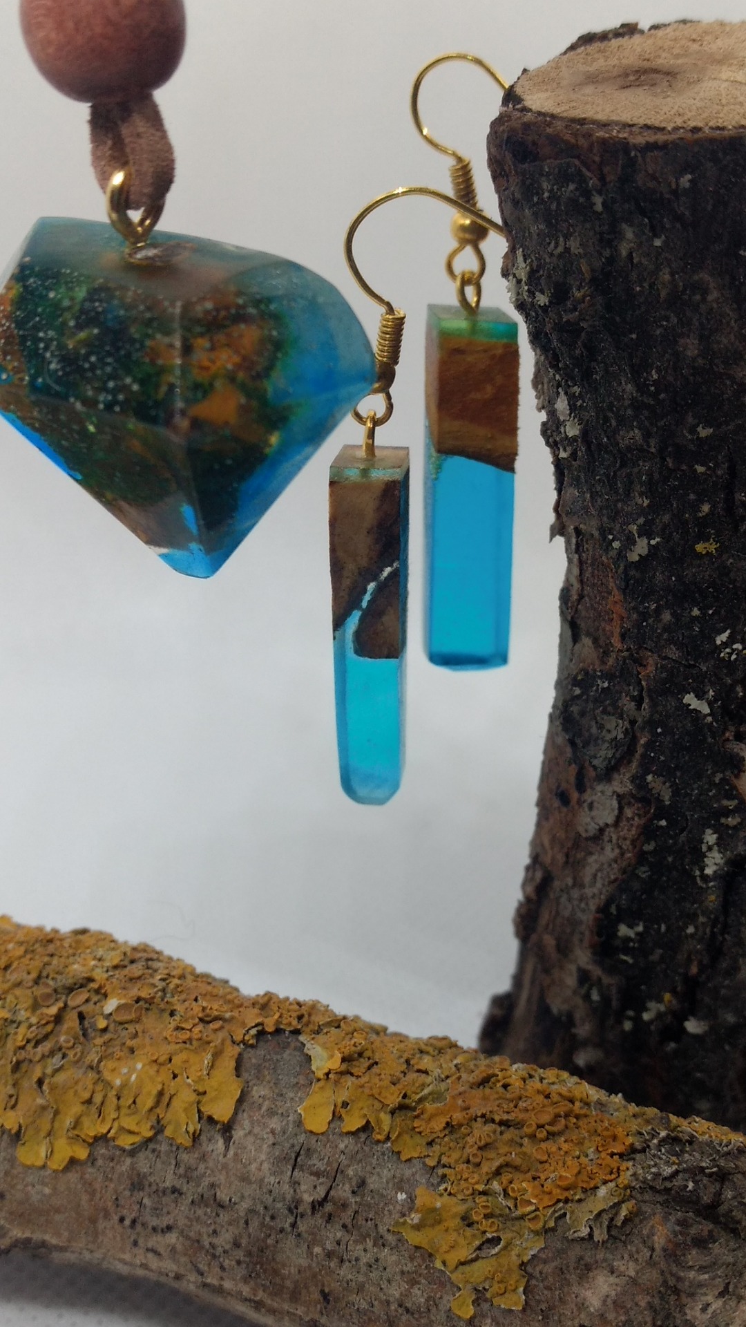 Set din 3 piese : Cercei si pandativ forma diamant din rasina si lemn de salcam si de prun plus licheni.