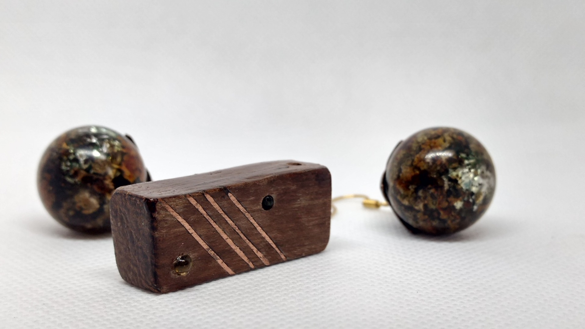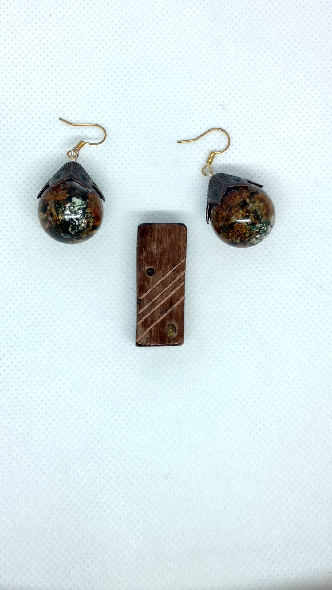 Set pandativ cu insertie de cupru si pietre - cuart ; Cercei cu insertie de licheni si staniol colorat decorativ