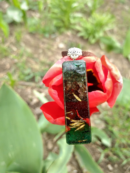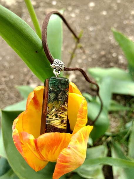Pandativ din stamine de flori, licheni galbeni si scoarta de copac.