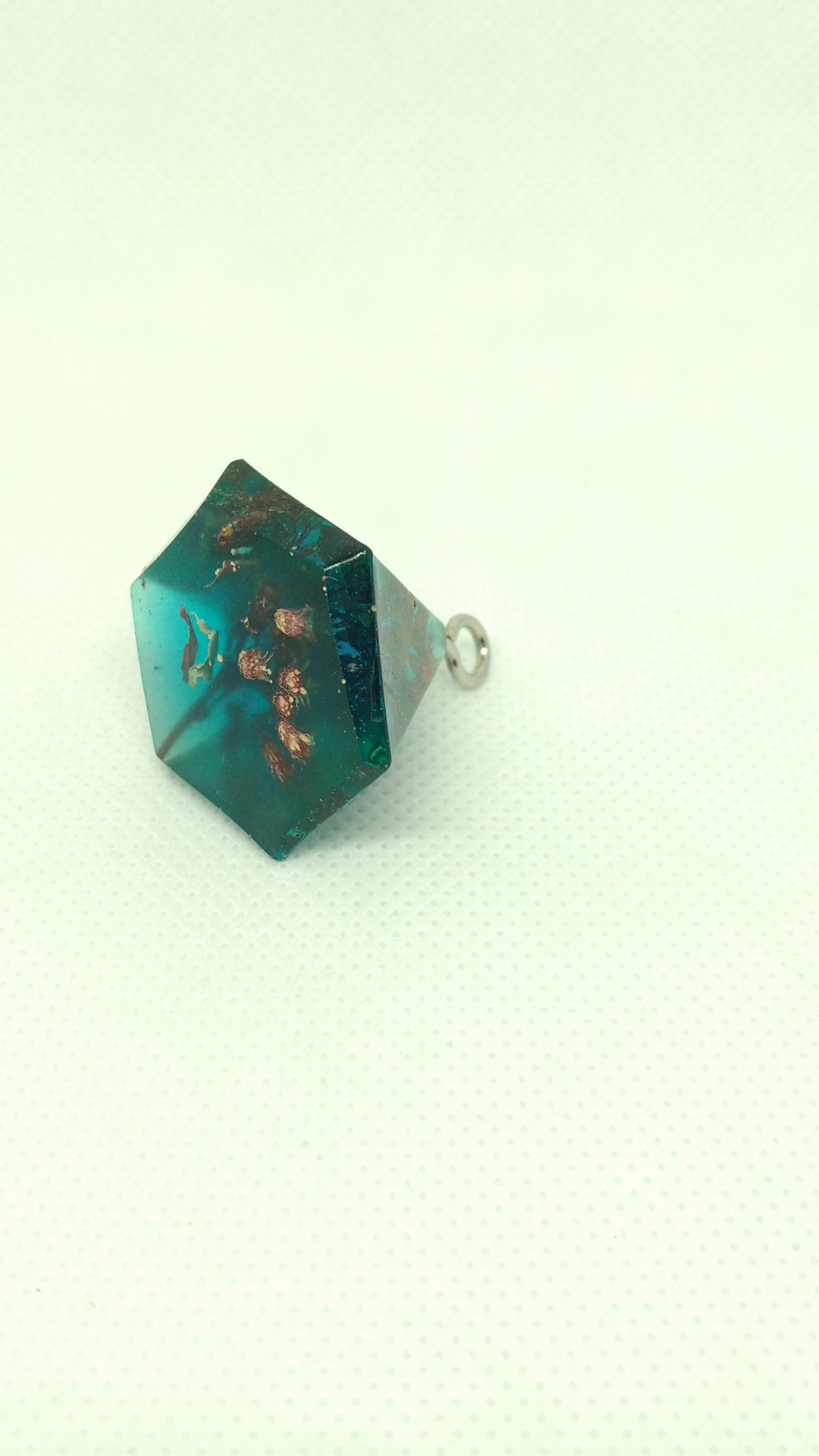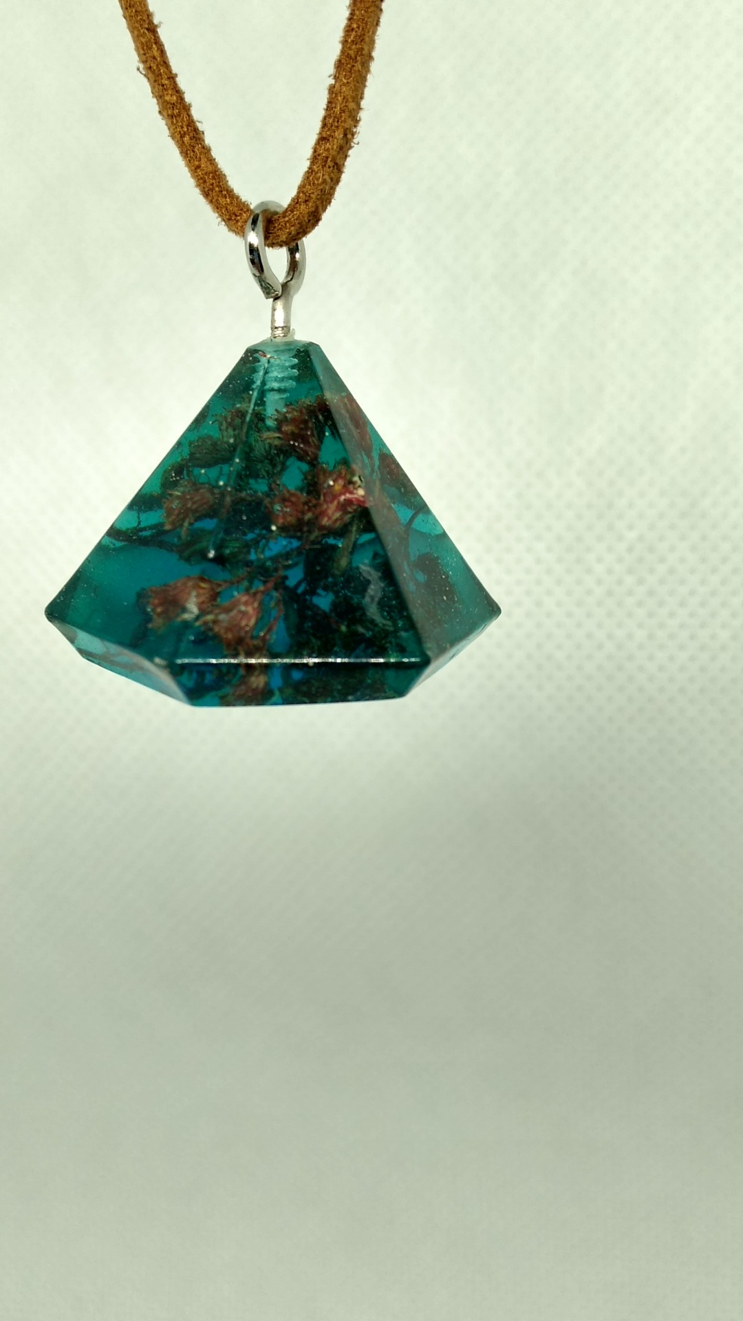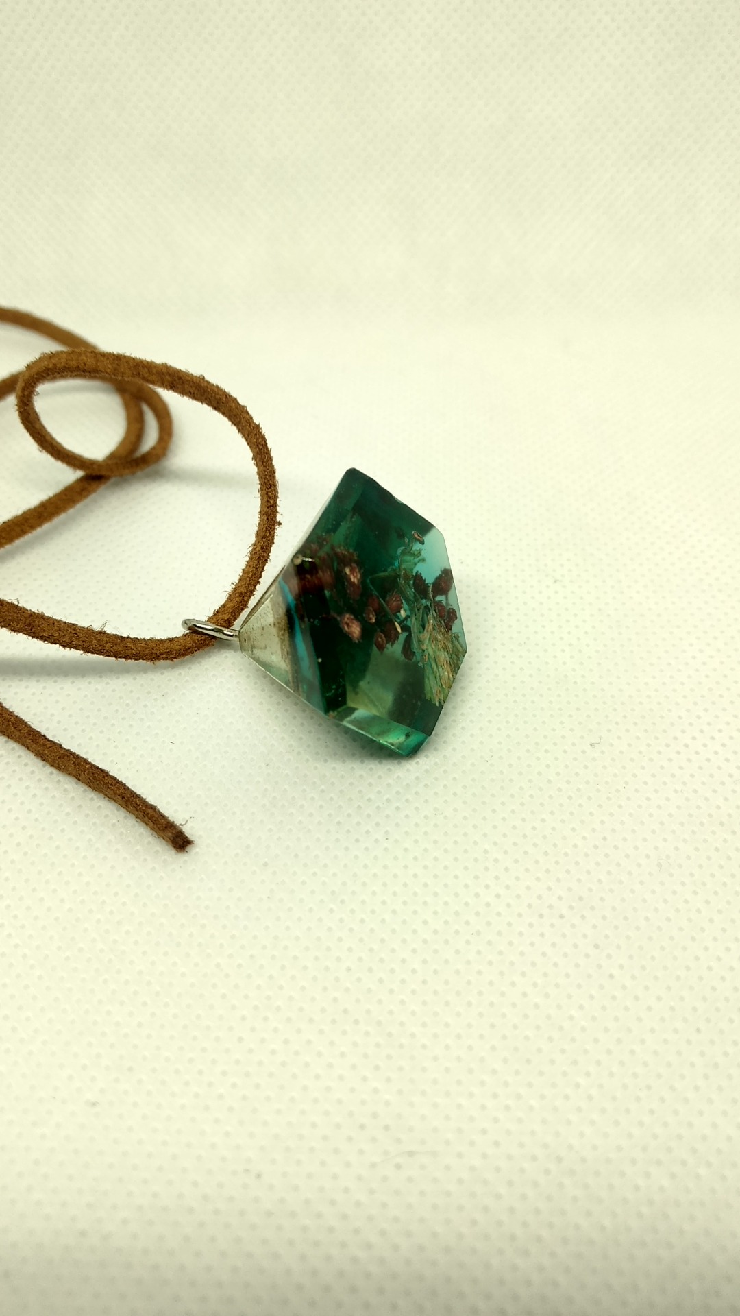 Rasina pigment albastru/verde cu insertii de bucatele de lelmn diferite specii, flori uscate si licheni.