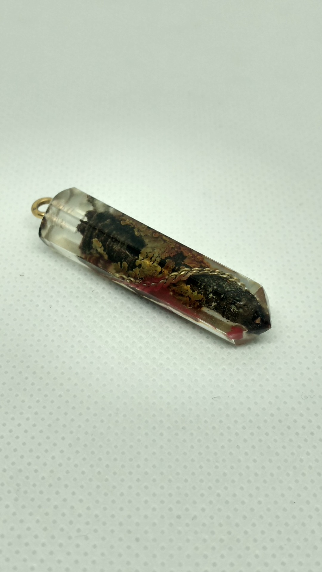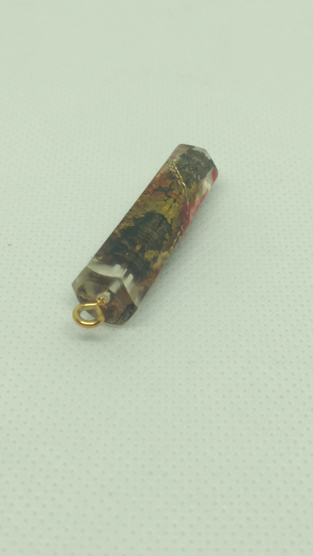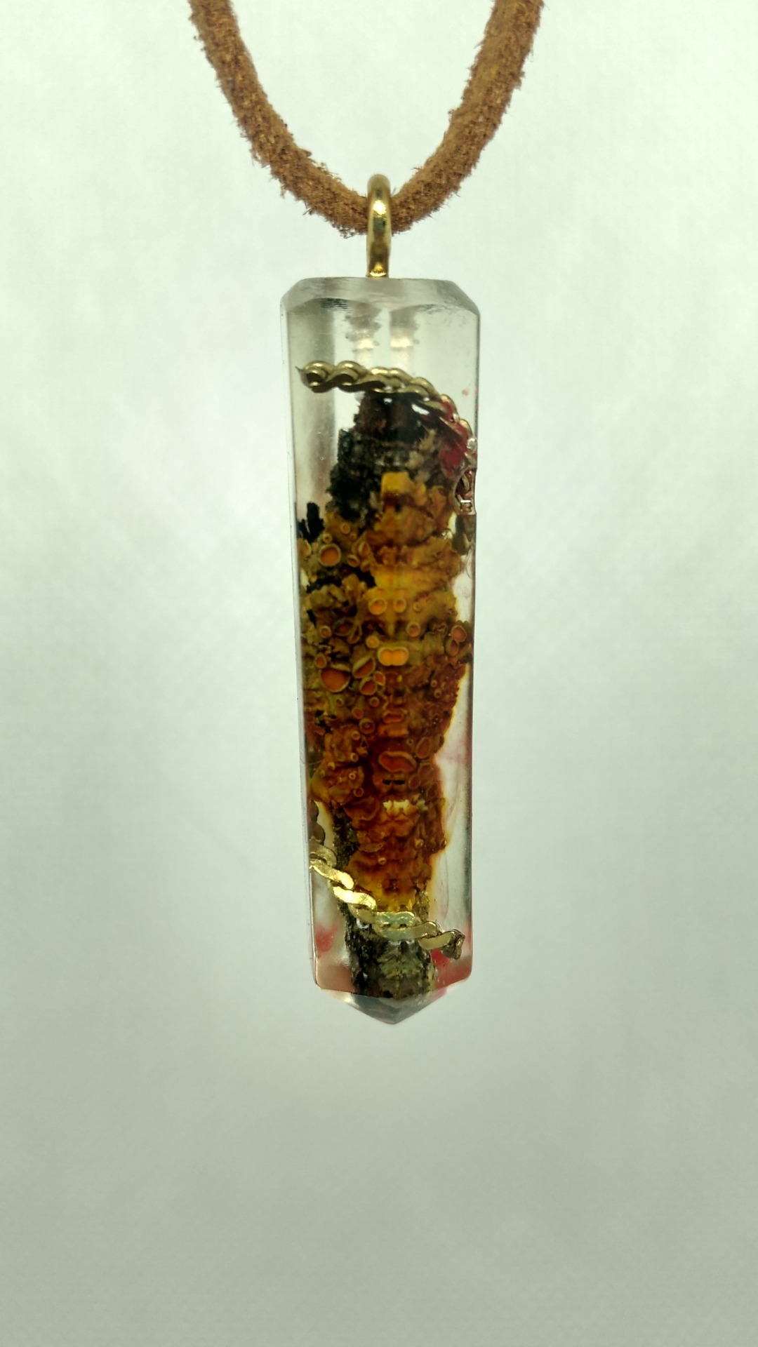 Pandativ din licheni, lant neferos si scoarta de copac inserata in rasina. O imagine magnifica a naturii dezlantuite.