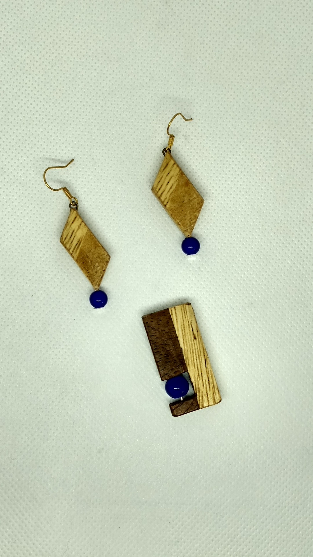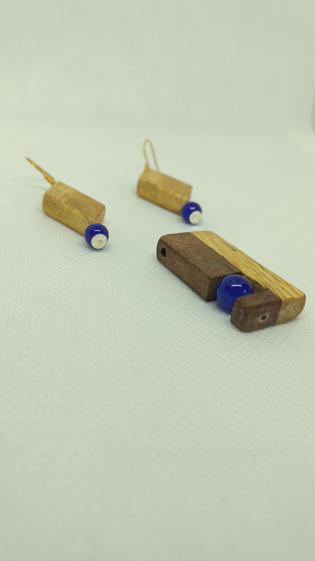 Set din lemn de sapelli di fag, decoratie din margele plastic albastre.