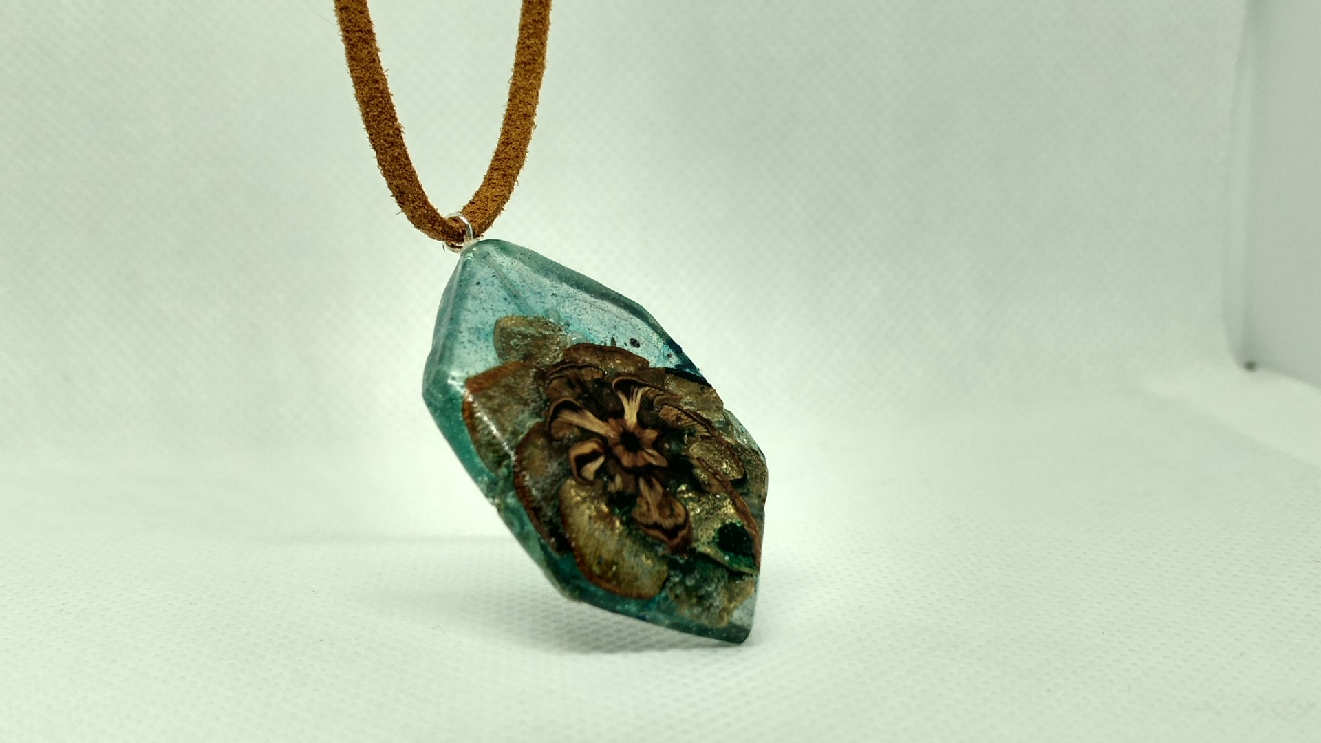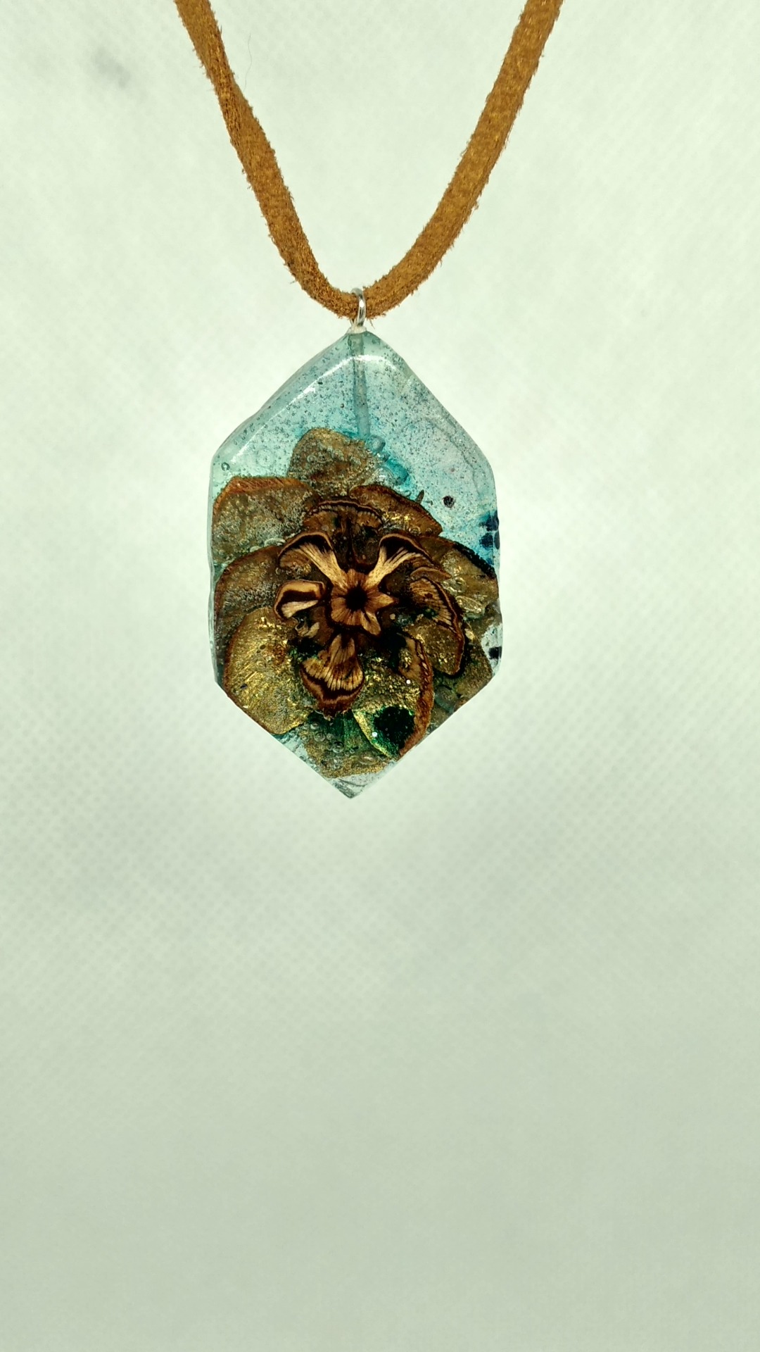 Pandativ din felie de con de pin aurita incastrata in rasina aerata pigment albastru.Real handmade.