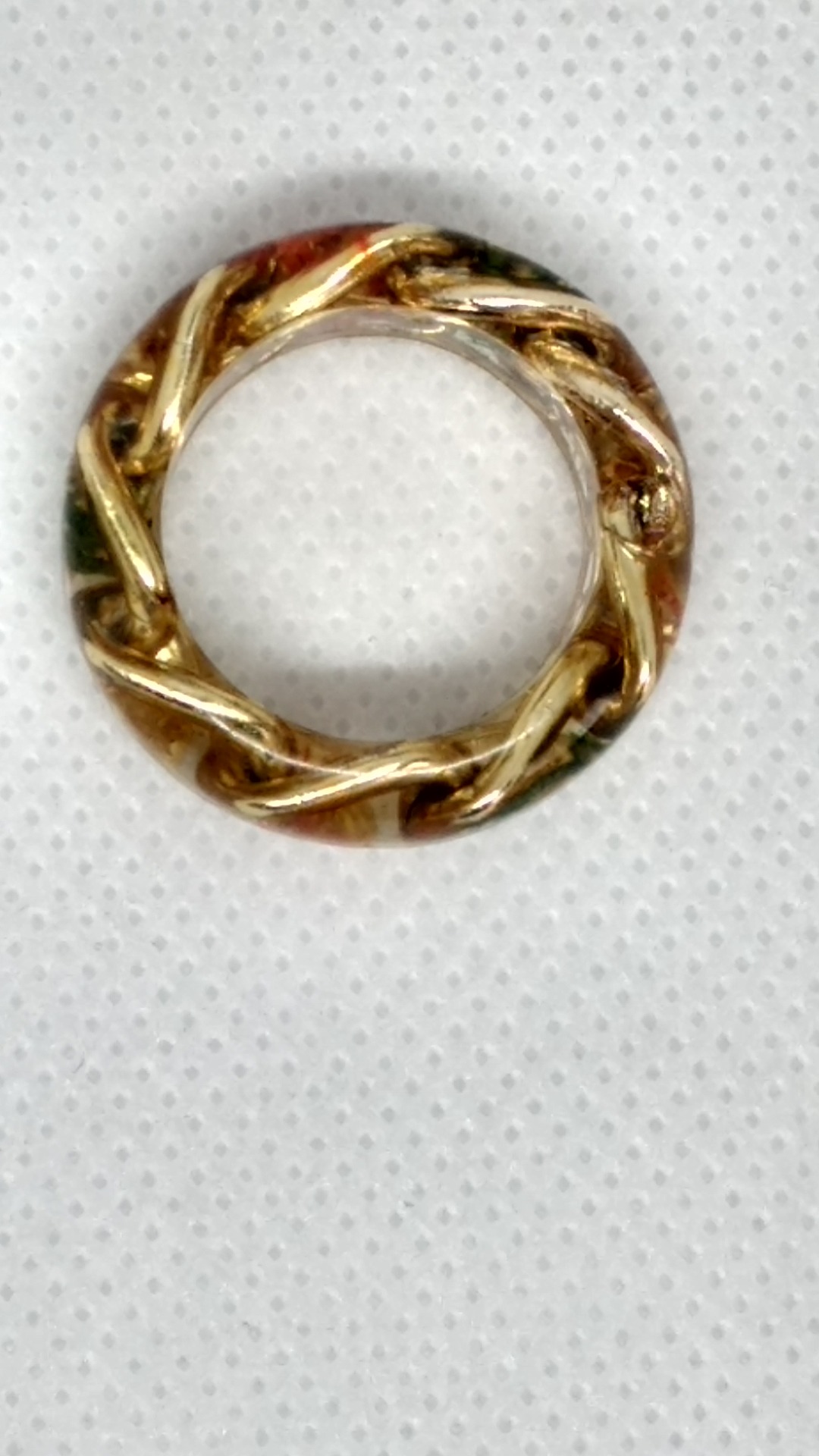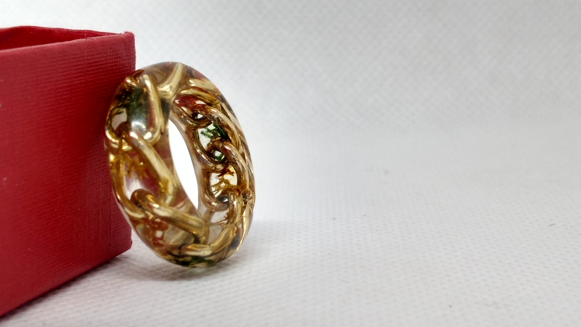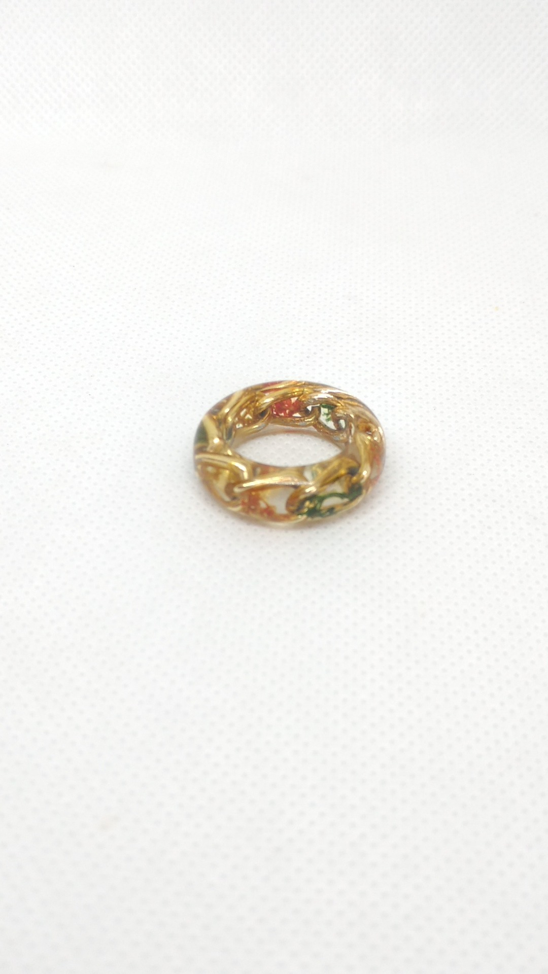 Inel marime medie din rasina cu insertie flori uscate si licheni, inclusiv un lantuc din aluminiu aurit ce da un aer complex piesei.