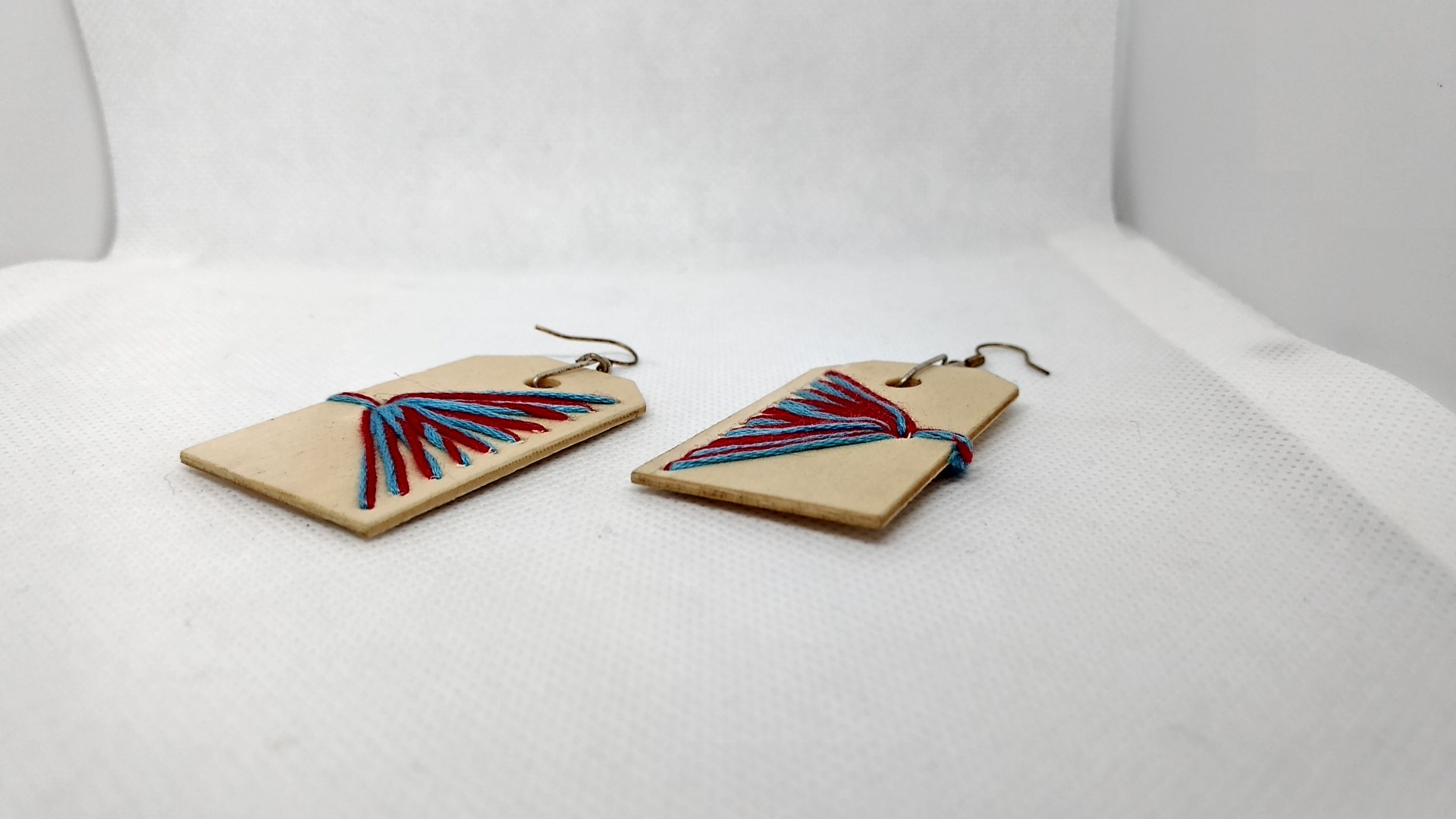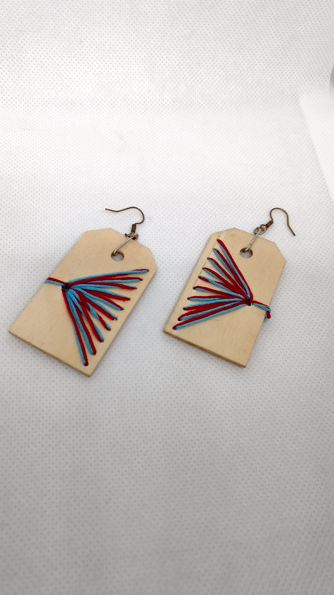 Cercei din lemn de placaj cu ata rosie si albastra cusuta in forma de floare.HANDMADE.