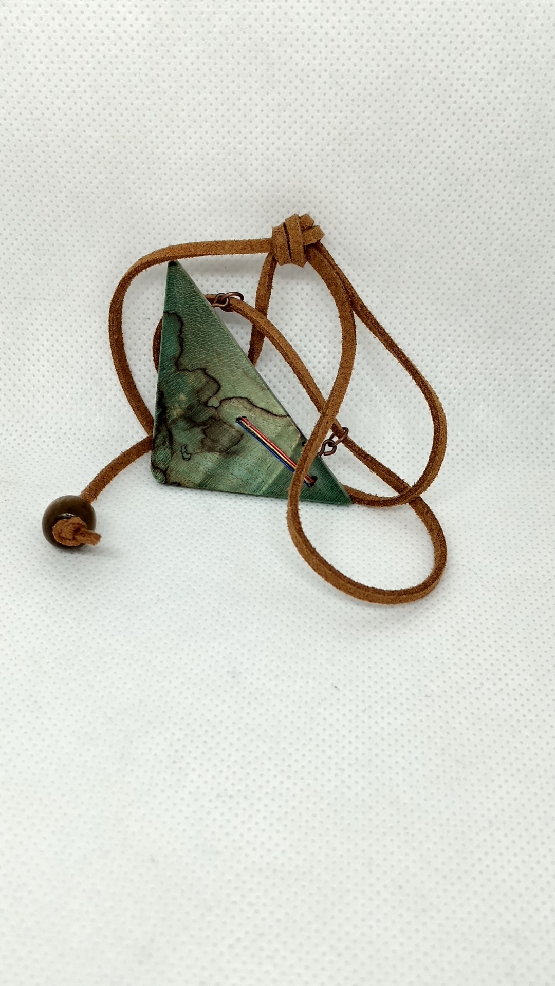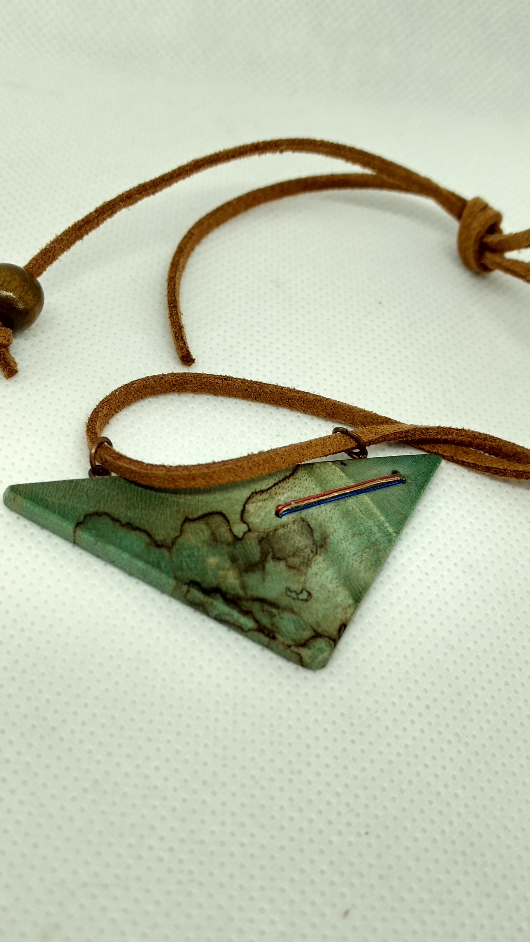 Pandant din lemn de paltin stabilizat cu rasina pigment verde.Deco - fir metalic tricolor.